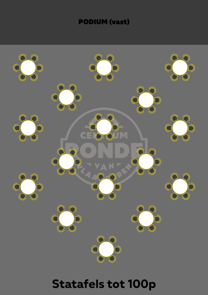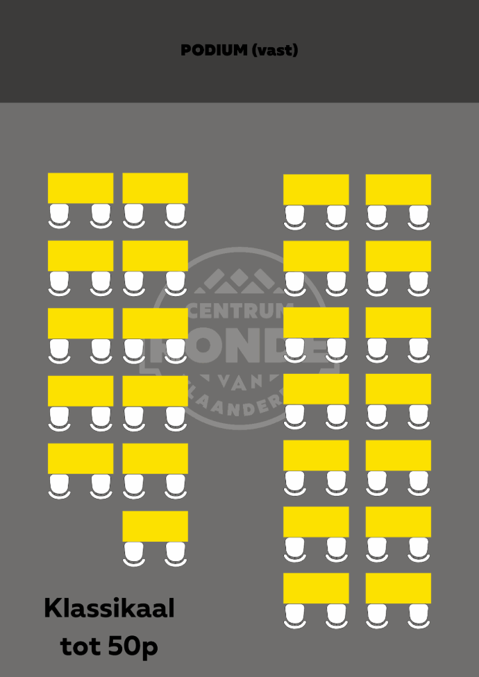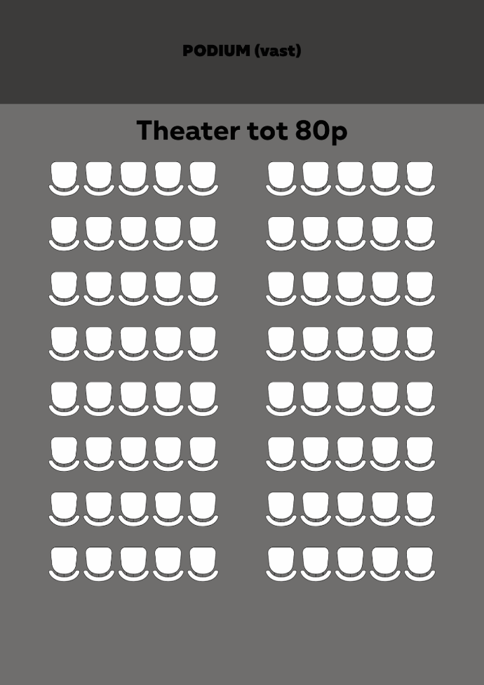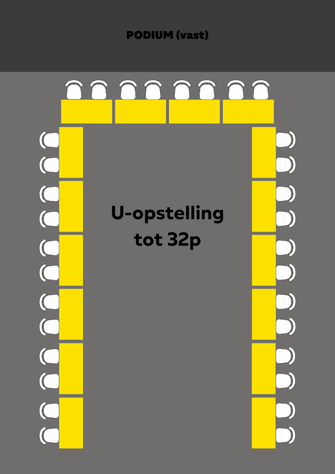 U-opstelling (tot 32 personen) Klassikaal (tot 50 personen) Theater (tot 80 personen) Statafels (tot 100 personen) |